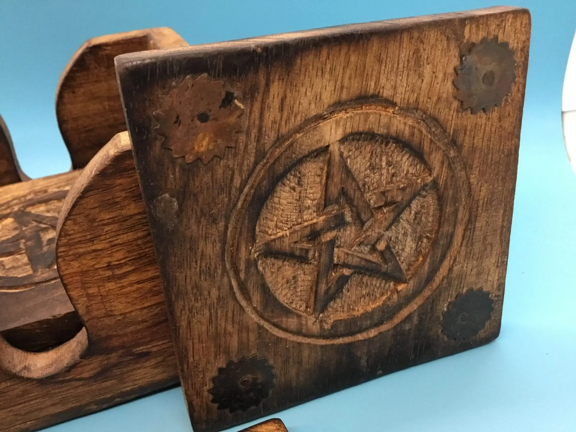 Antique style Old, Wood coaster set, Pentacle Carved